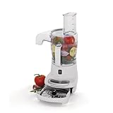 With its powerful 350-watt motor, this convenient food processor quickly and easily slices, shreds, dices, chops, and purees, helping to reduce prep time in the kitchen. The unit features a shatterproof 4-cup work bowl and a wide-mouth design with a food pusher for adding food while continuously processing. Its control panel offers two buttons for selecting low and high speed settings or "pulse" to deliver an extra burst of power when needed. Use the machine to quickly blend up batches of pesto, chop onions and green peppers for a veggie pizza, or shred cheese for omelets on a Sunday morning--the options are endless. Other highlights include overload reset, a continuous flow lid, a disc and flow stopper for processing into the 4-cup bowl, and a drawer for storing the accessories when not in use. A stainless-steel reversible slicing-and-shredding disc and a chopping blade come included. The food processor measures approximately 10-1/5 by 9-2/5 by 14 inches.